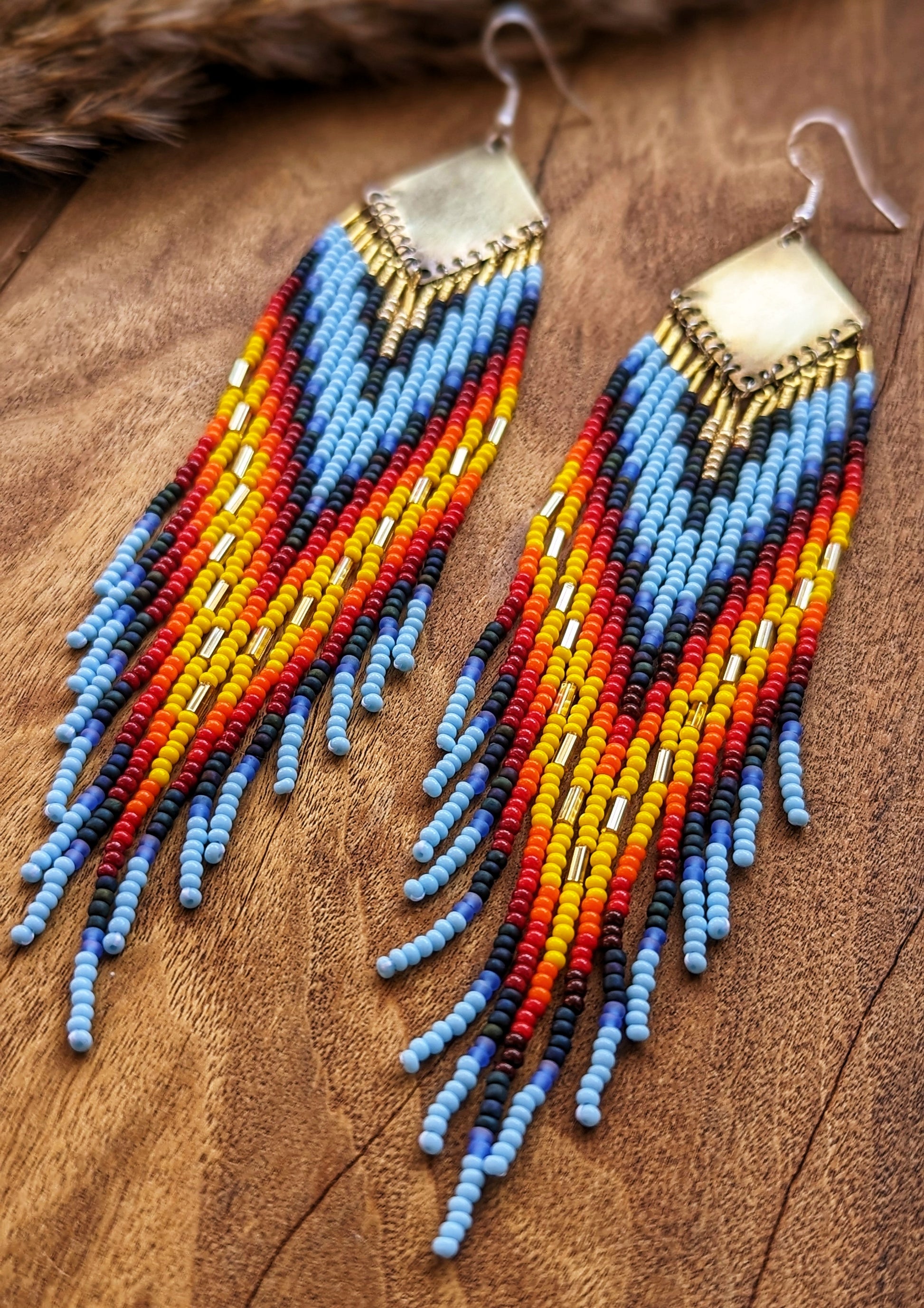 - Handmade native beaded earrings created with glass beads, hand-stamped brass, Japanese nylon thread, and sterling silver ear wires.