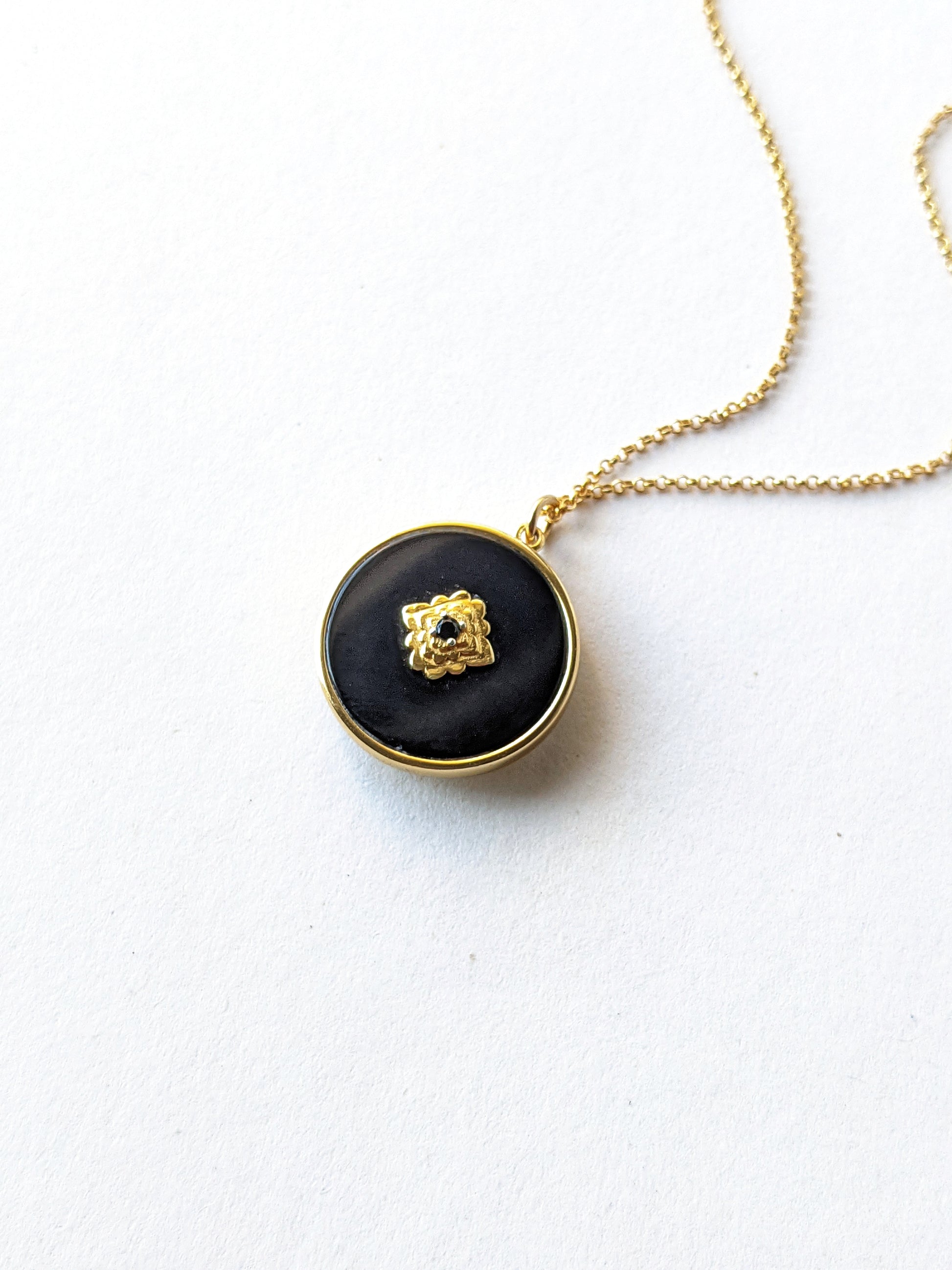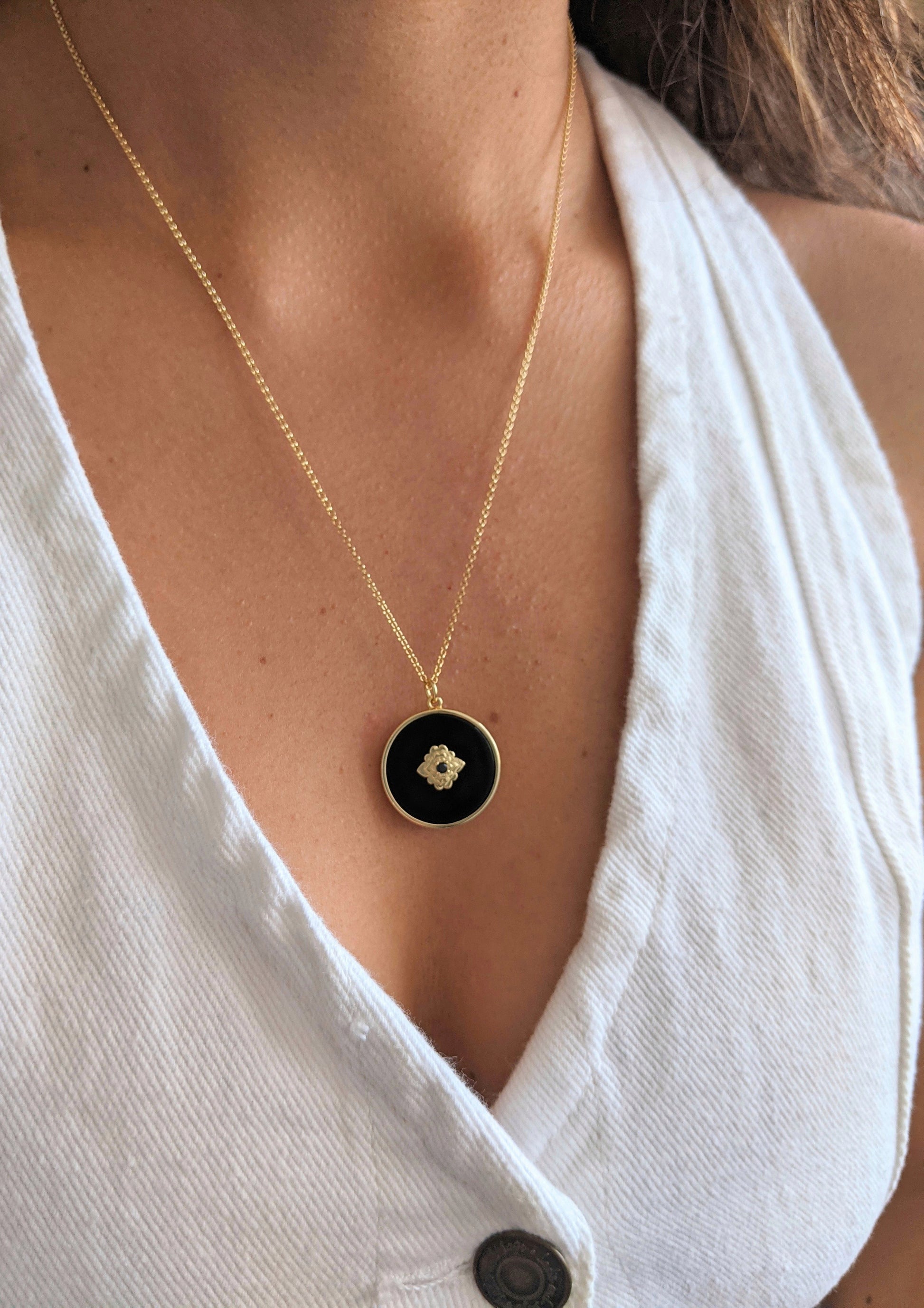 Elevate your jewelry game with this reversible pendant necklace, designed for those who love versatility without compromising style. One side features a striking black onyx backdrop adorned with a delicate gold floral motif, exuding bold sophistication. Flip it over to reveal an ethereal mother-of-pearl surface embellished with a shimmering CZ at the center, perfect for a softer, more romantic look.