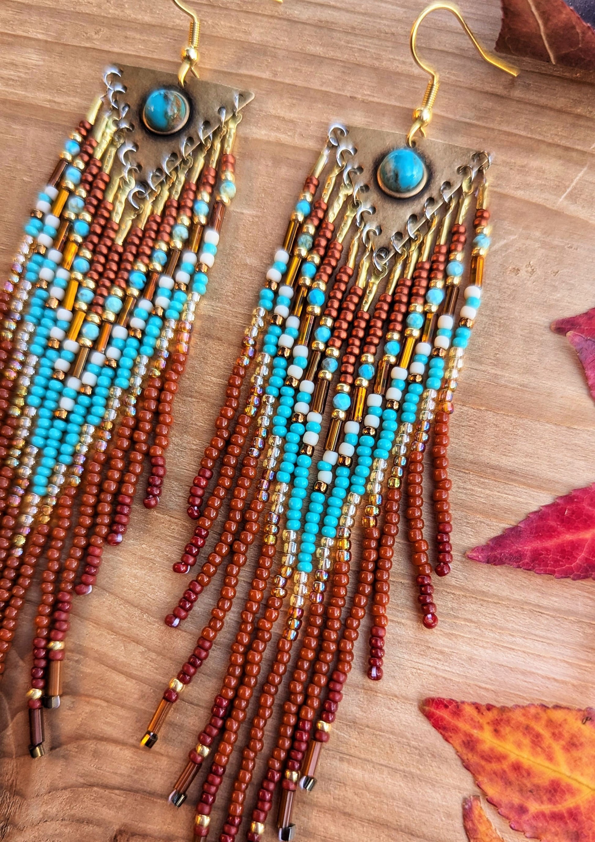Inspired by the majestic hues of Southwest canyons, these boho earrings echo the layered reds, browns, and blues of sunlit rock formations and winding riverbeds. The deep, earthy tones blend with vibrant turquoise, mirroring the contrast between rugged cliffs and open skies. Cascading like sandstone cliffs carved by time, each strand tells a story of strength and resilience, grounded in nature’s artistry.