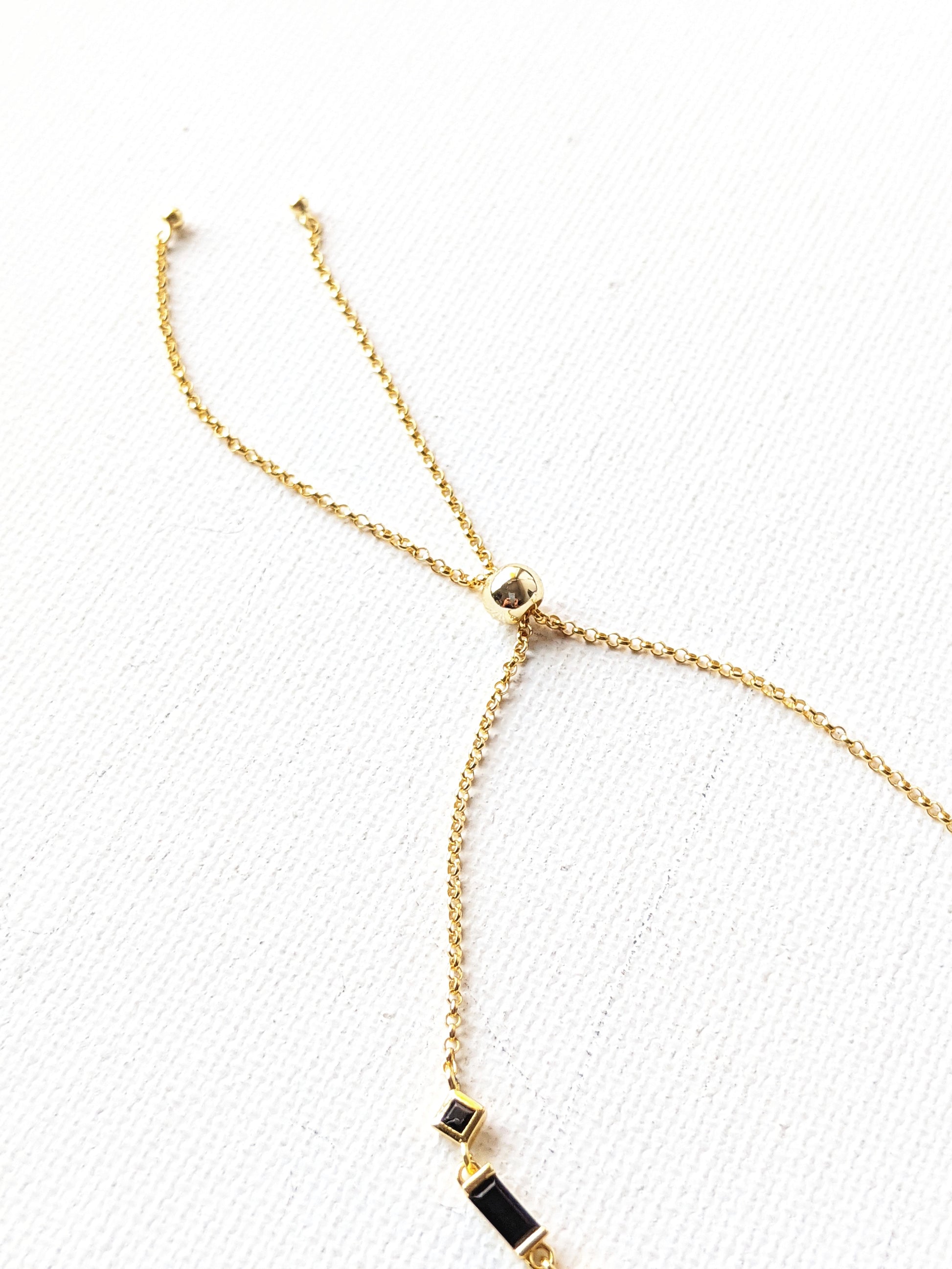 The Tenayuca Gold Bracelet in Black Baguette Crystals is designed with dainty, asymmetrical shapes linked by a bolo chain. Layer for a little extra something in your minimalist stack!