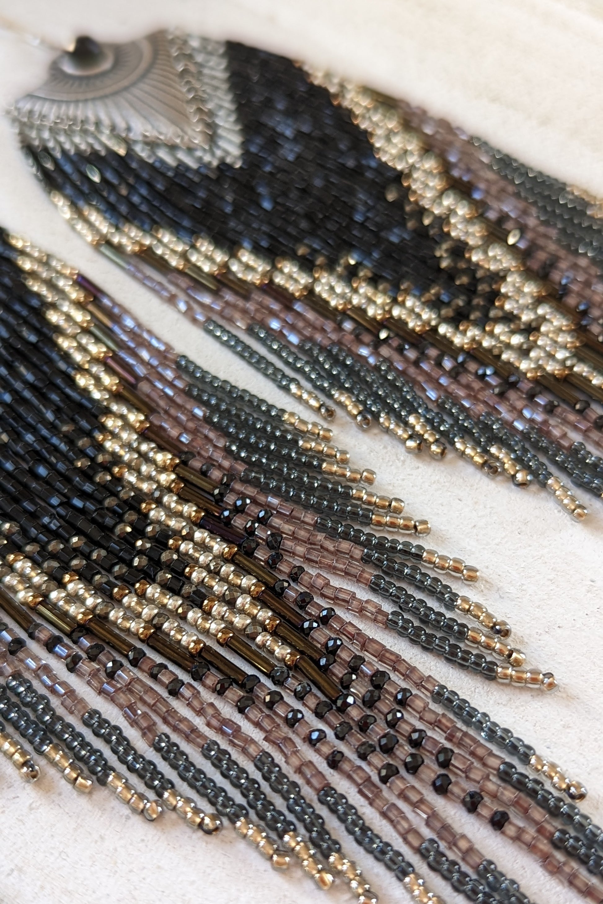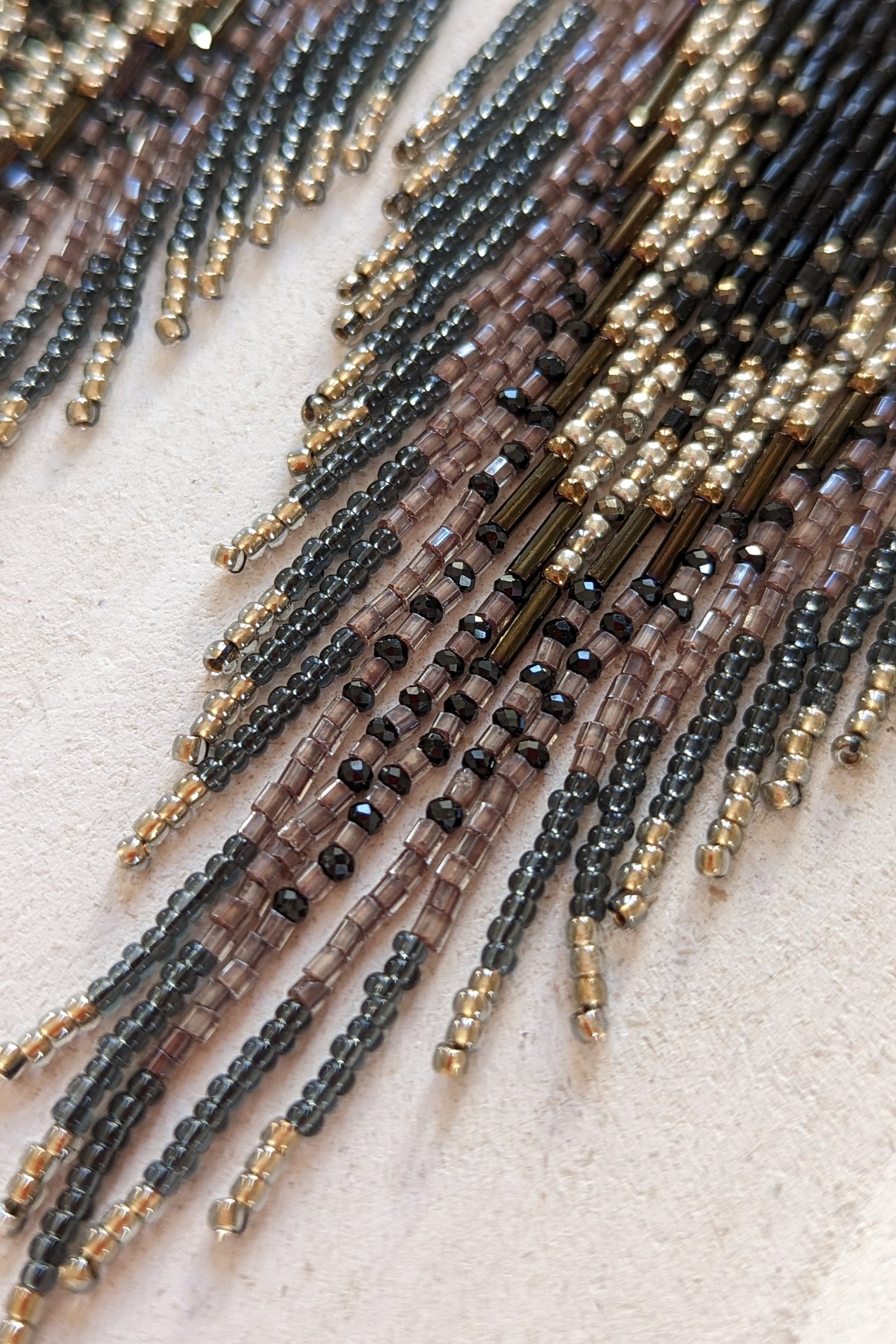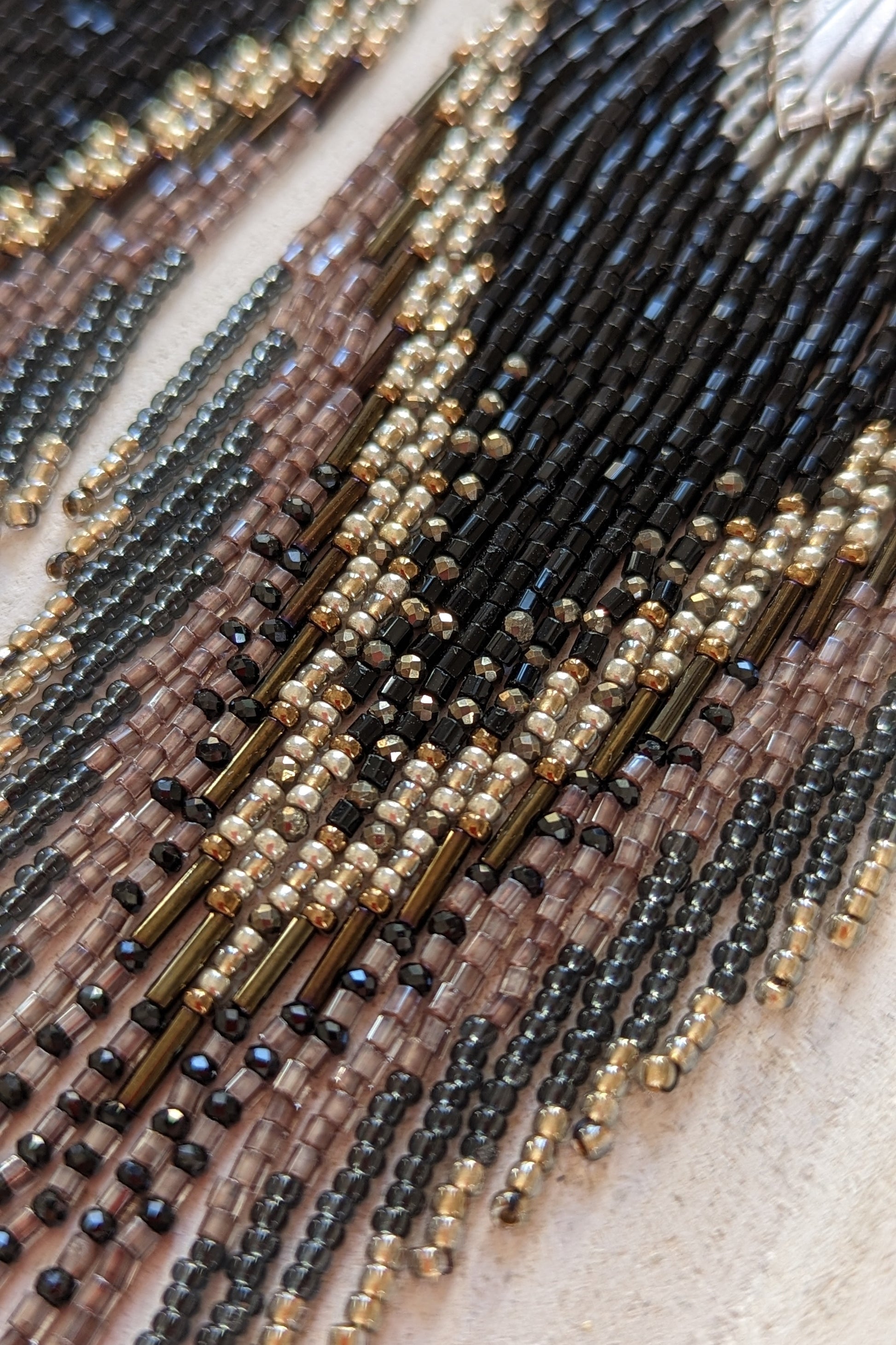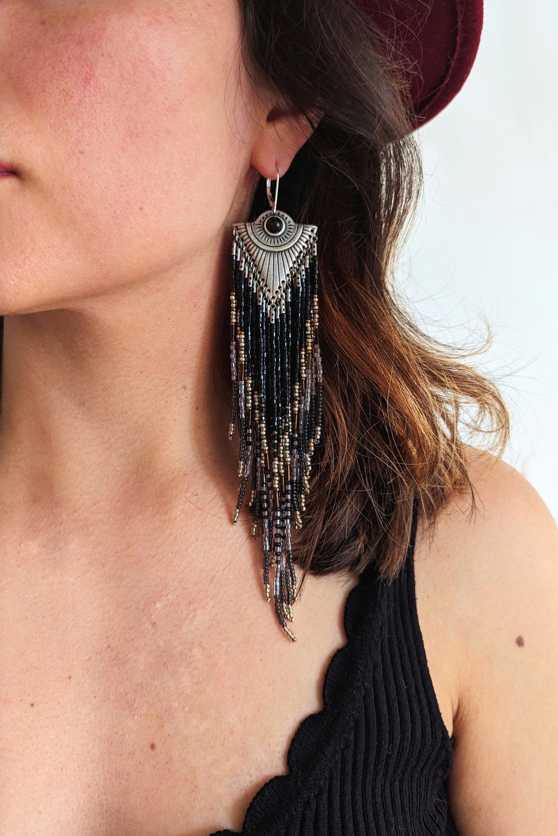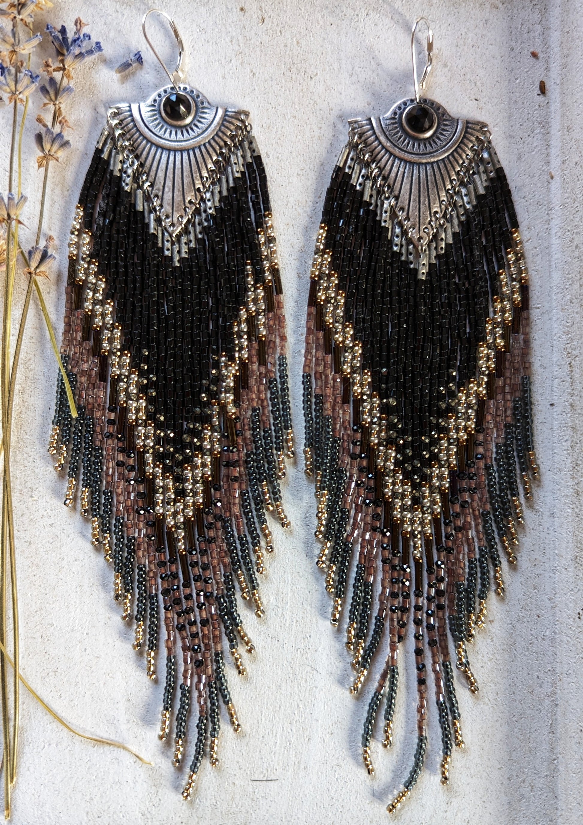 - Handmade beaded earrings created with semi-precious stones, glass beads, and brass.