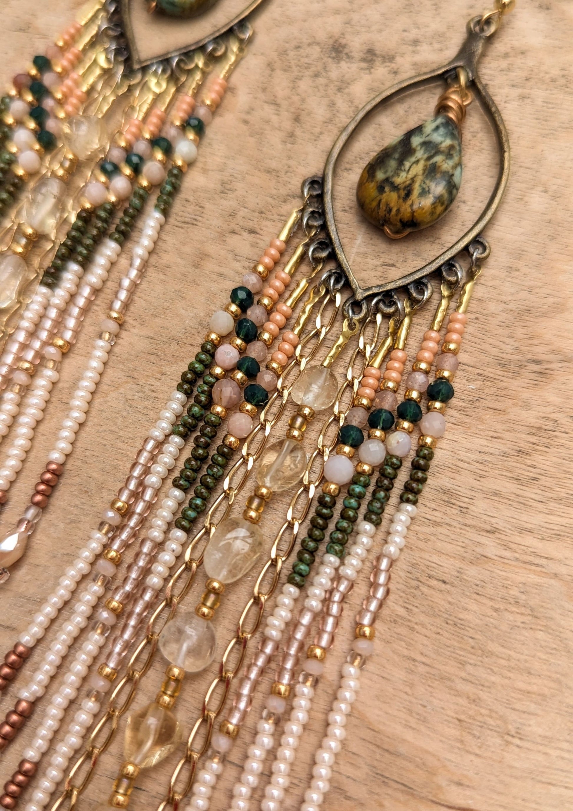 This is The Arrival. The moment you realize that everything you needed to become who you are was all along inside you. Crafted with citrine, African turquoise, crystal quartz, Peruvian opal, peach moonstone, and Chinese glass, this pair carries the light of completion. These earrings are for the woman who, with courage, moved through fires and storms, and she’s done becoming...