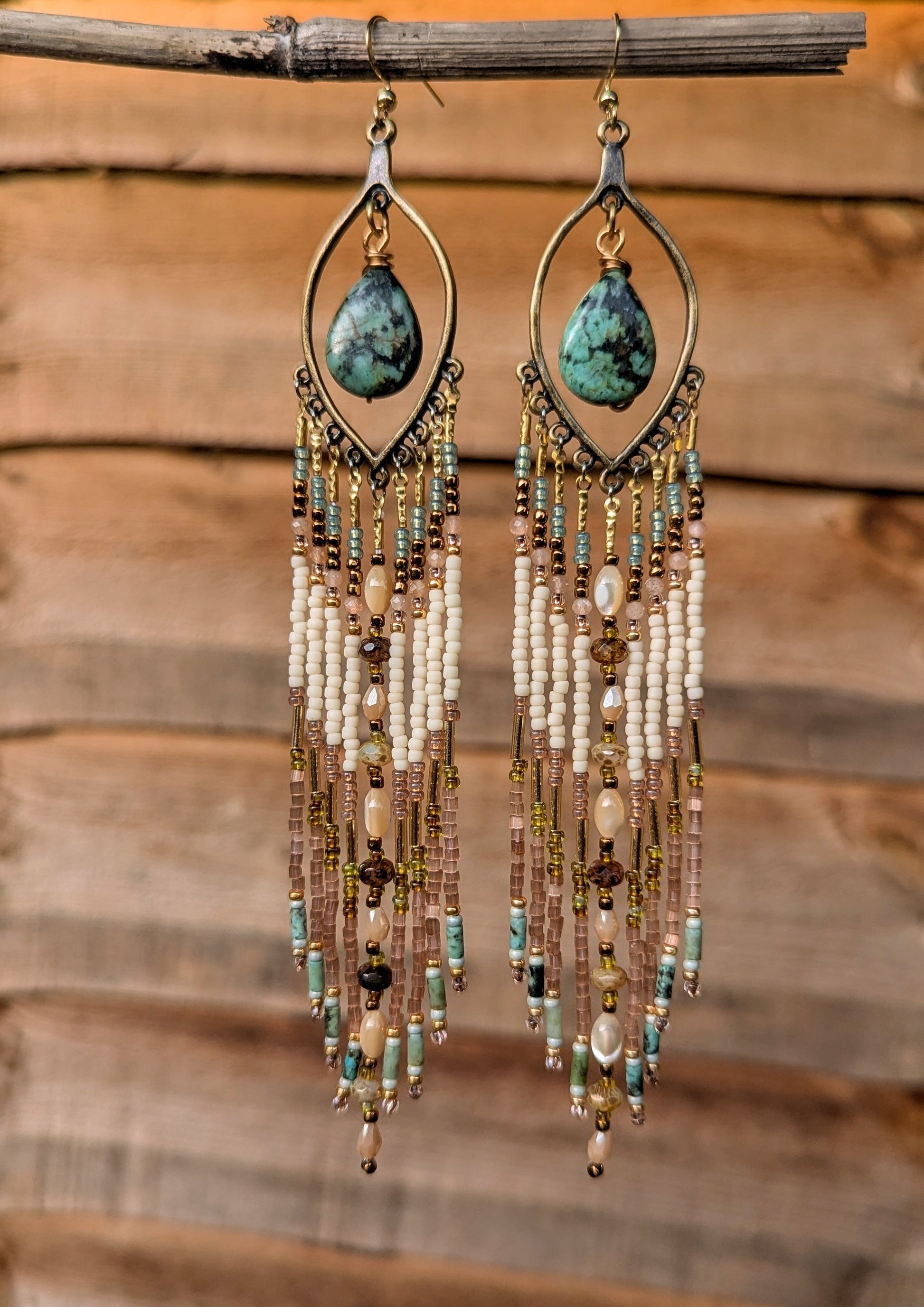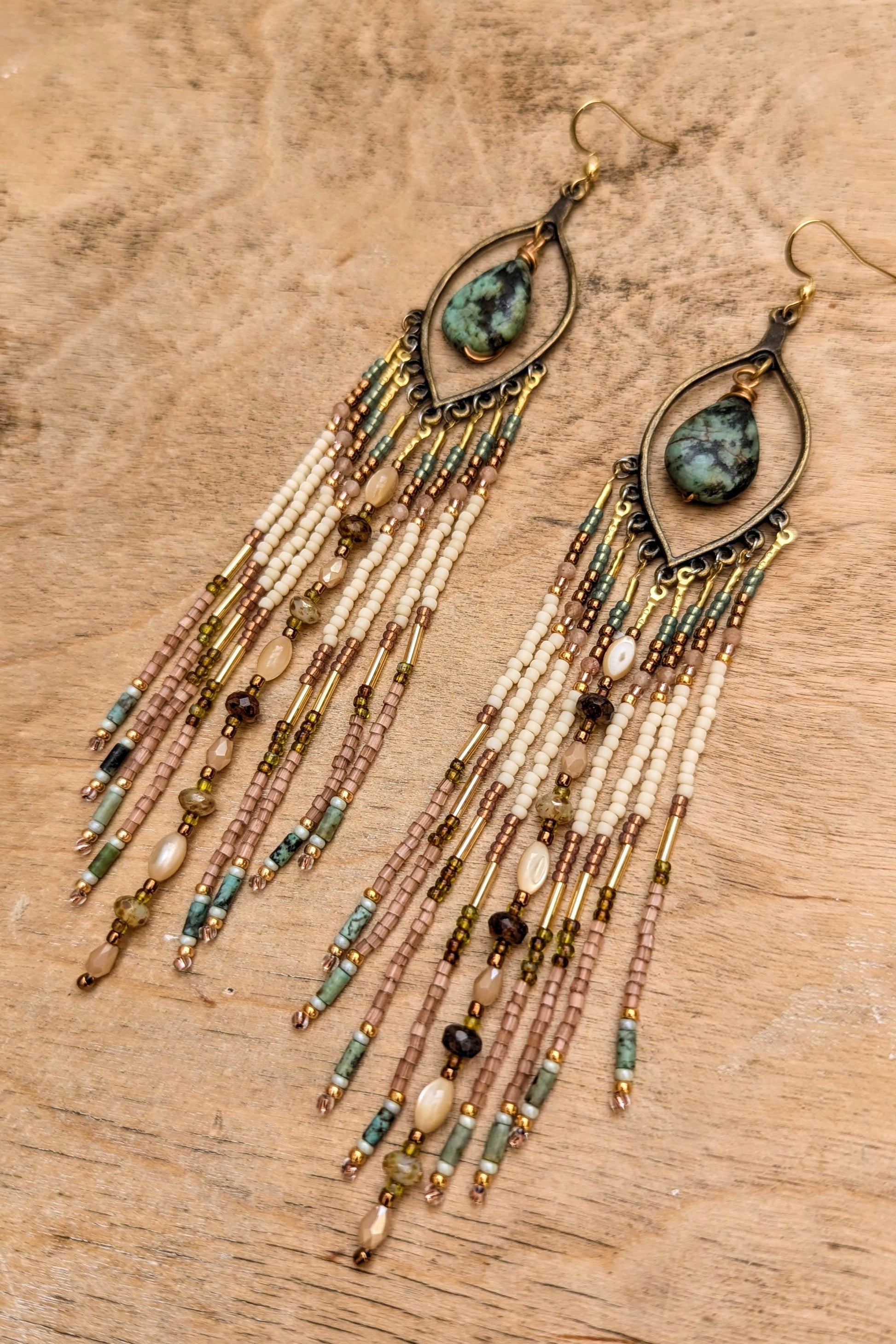- Handmade boho beaded earrings created with brass, glass beads, and Japanese nylon thread.