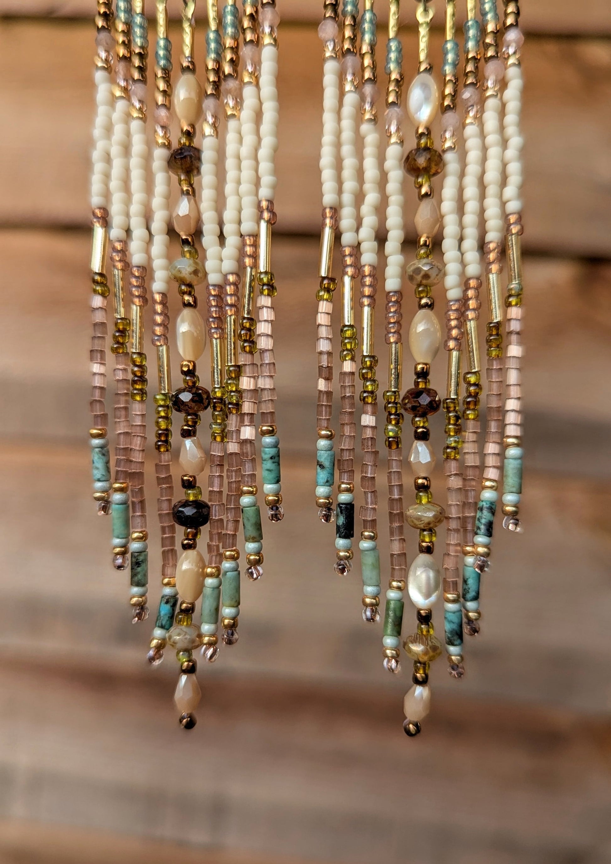 This pair speaks to the second verse of Ithaka, and it's about the monsters we carry inside of us. Crafted with wire-wrapped African turquoise, Czech fire-polished beads, mother-of-pearl rice beads, and turquoise tubes, these long beaded earrings hold both edge and softness. They’re for the woman who confronts what haunts her, who walks towards the fire knowing the only way out is through. The weight is intentional. The beauty is earned.