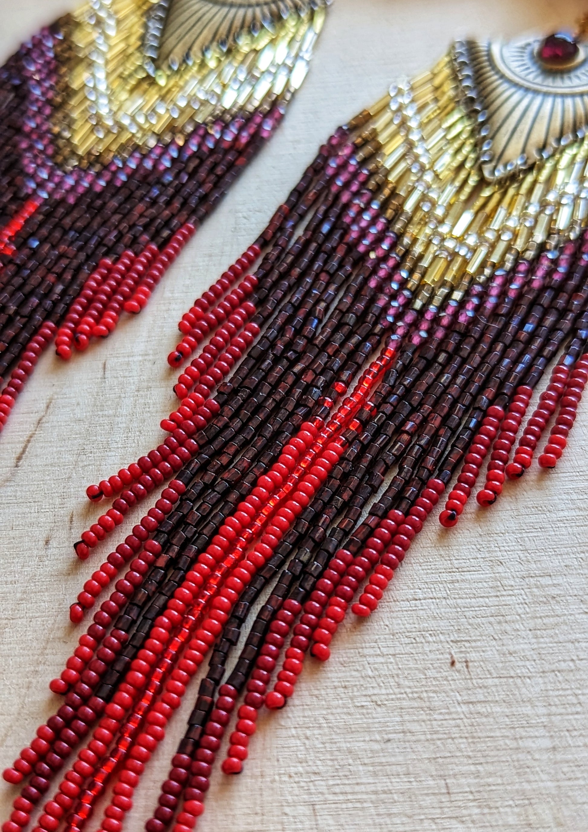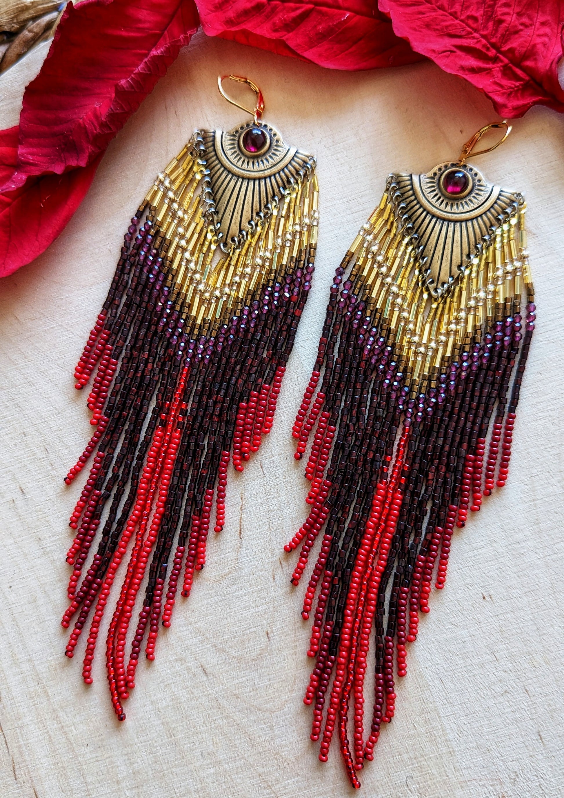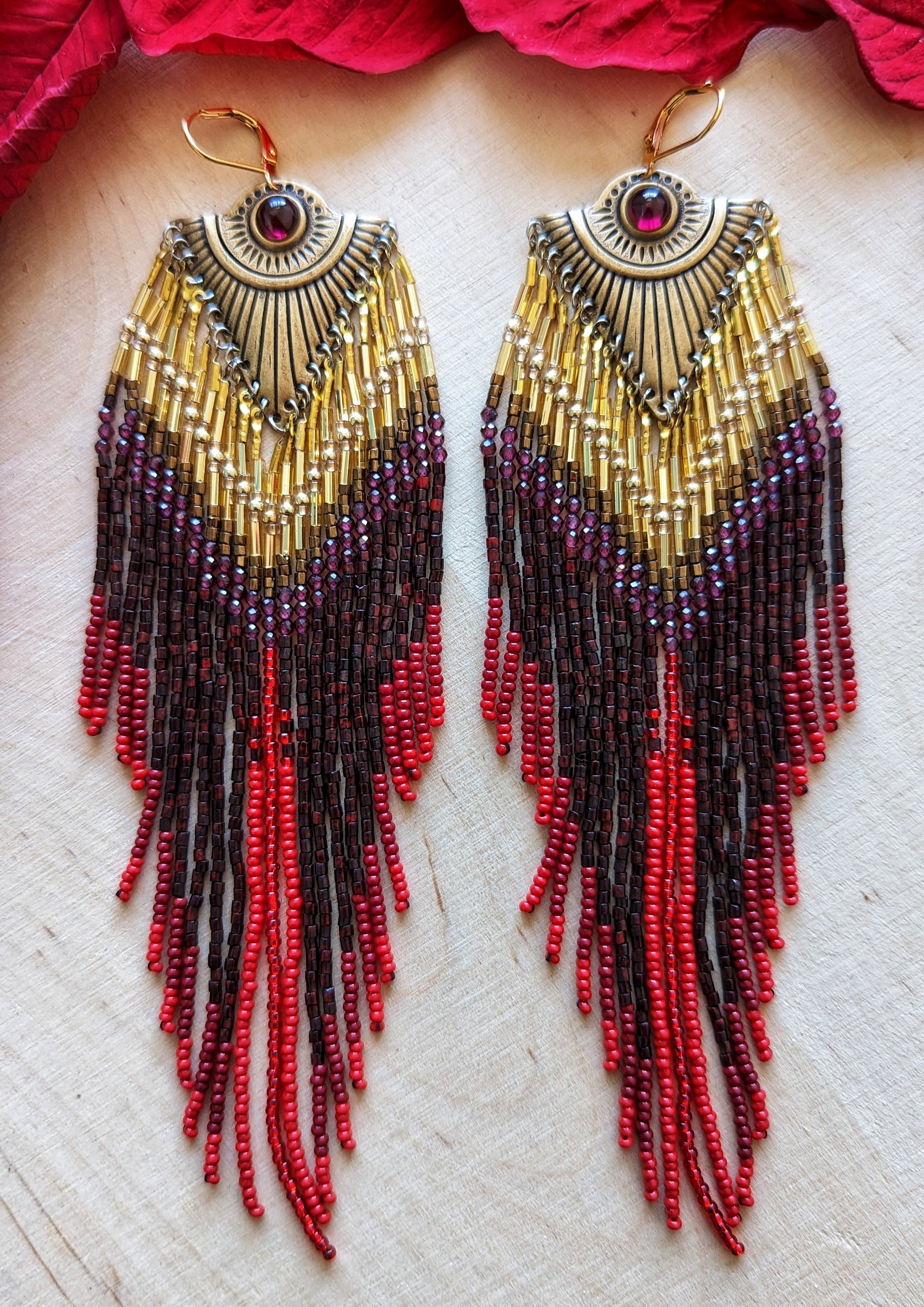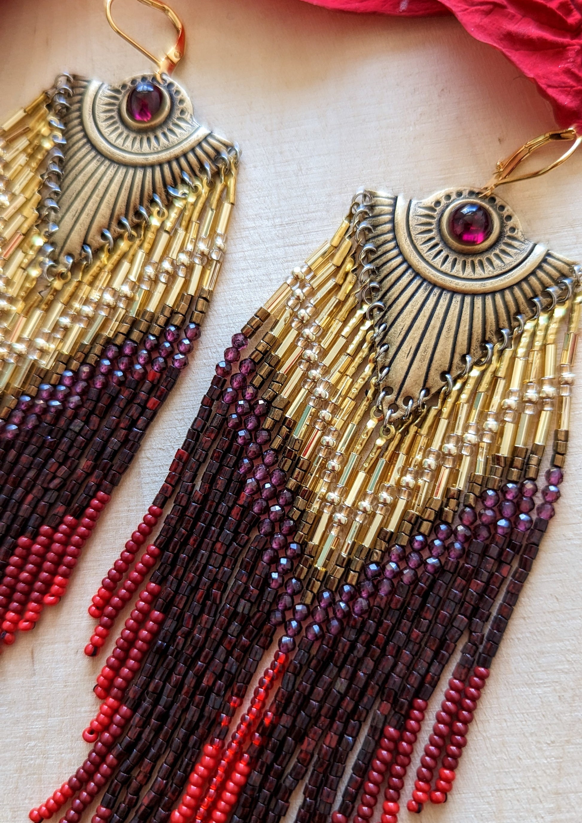 - Handmade beaded earrings created with semi-precious stones, glass beads, and brass.