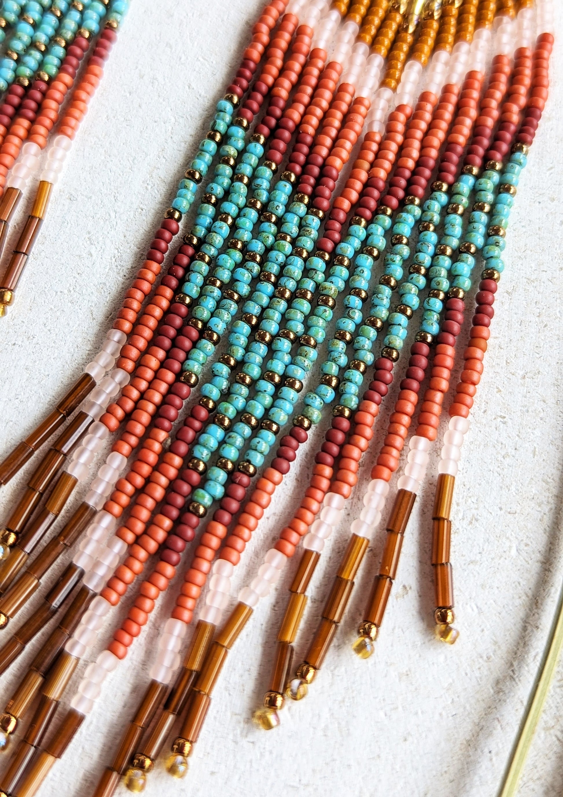 Elevate your look with the captivating charm of our southwest-style seed bead earrings. The combination of earthy tones, geometric patterns, and traditional beadwork techniques creates a striking accessory that effortlessly complements both casual and bohemian-inspired outfits.
