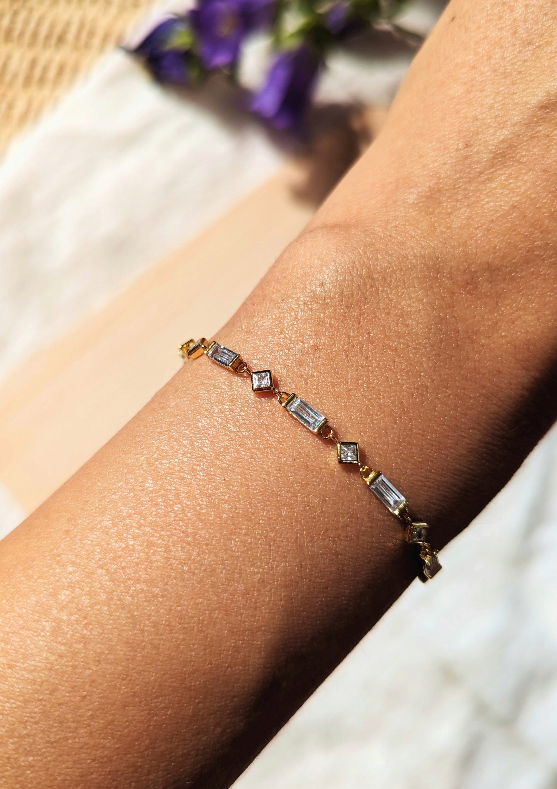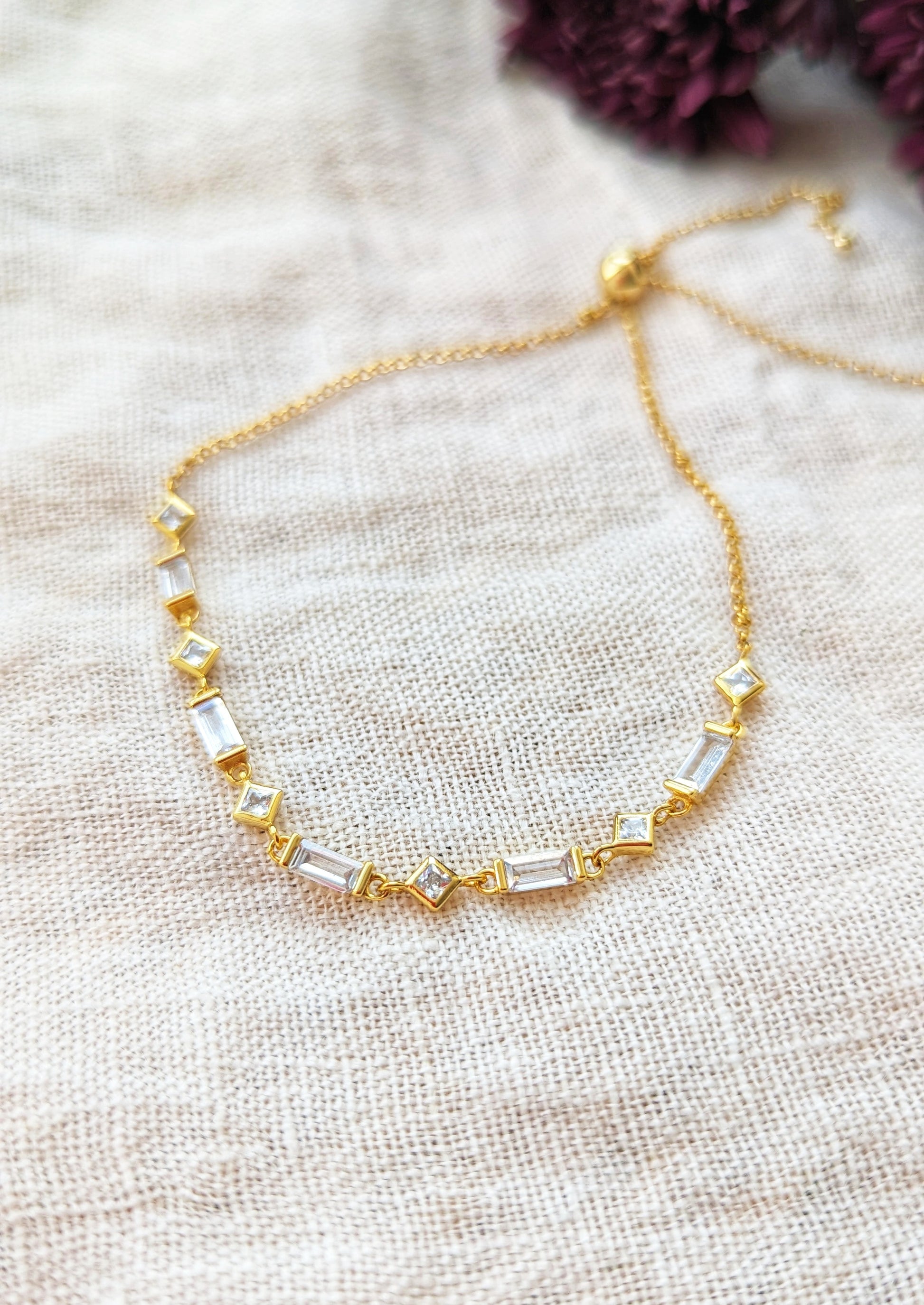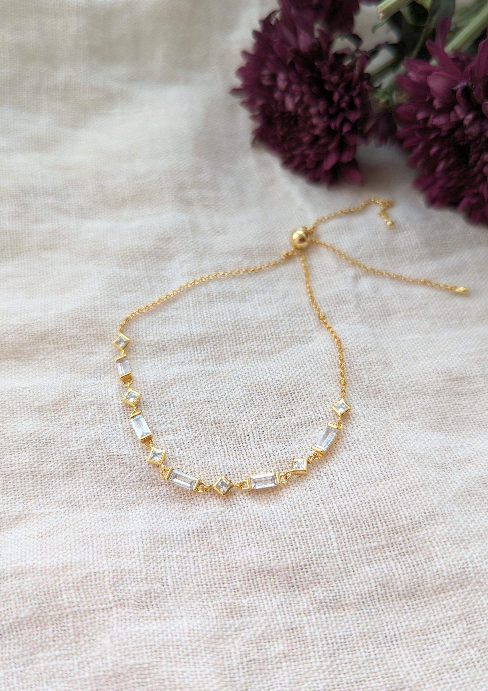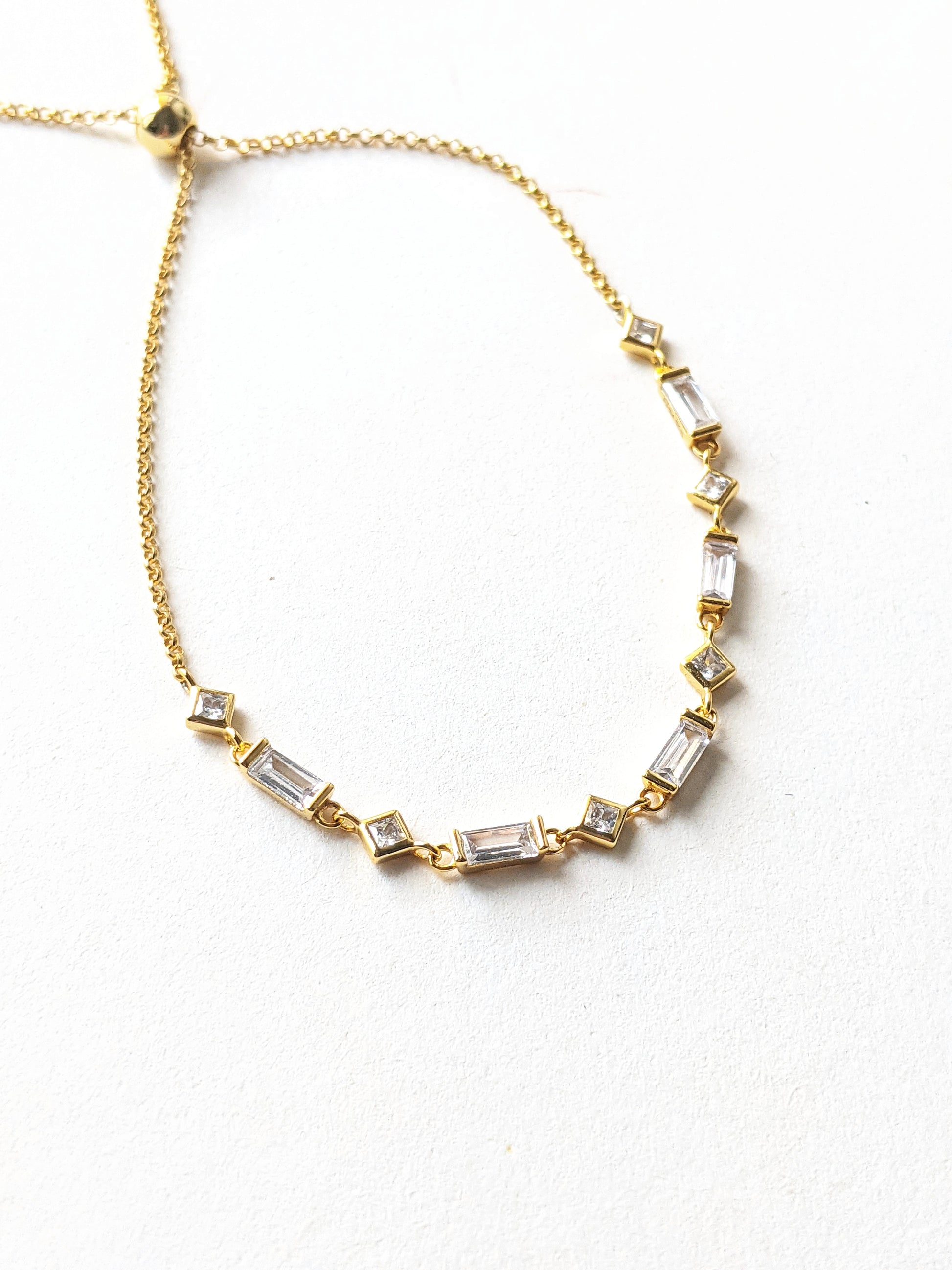 The Valentina Gold Bracelet in White Baguette Crystals is designed with dainty, asymmetrical shapes linked by a bolo chain. Layer for a little extra something in your minimalist stack!