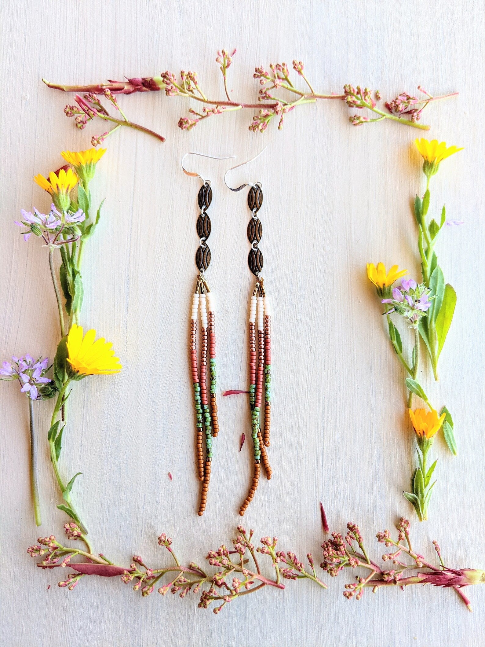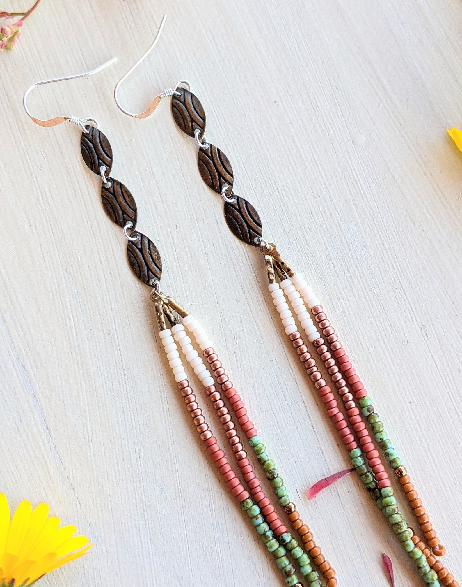 - Handmade seed bead earrings created with sterling silver, glass, and brass.