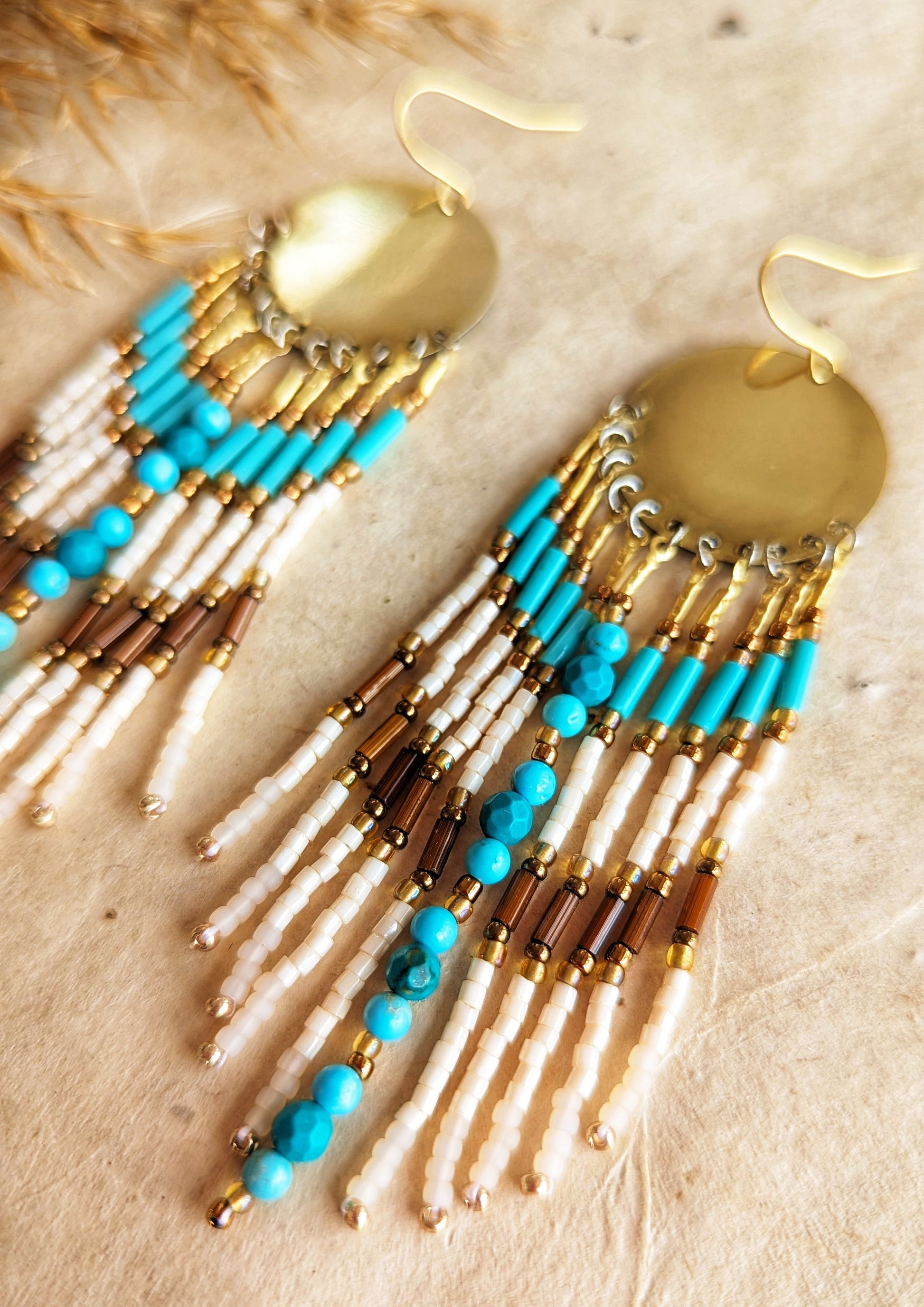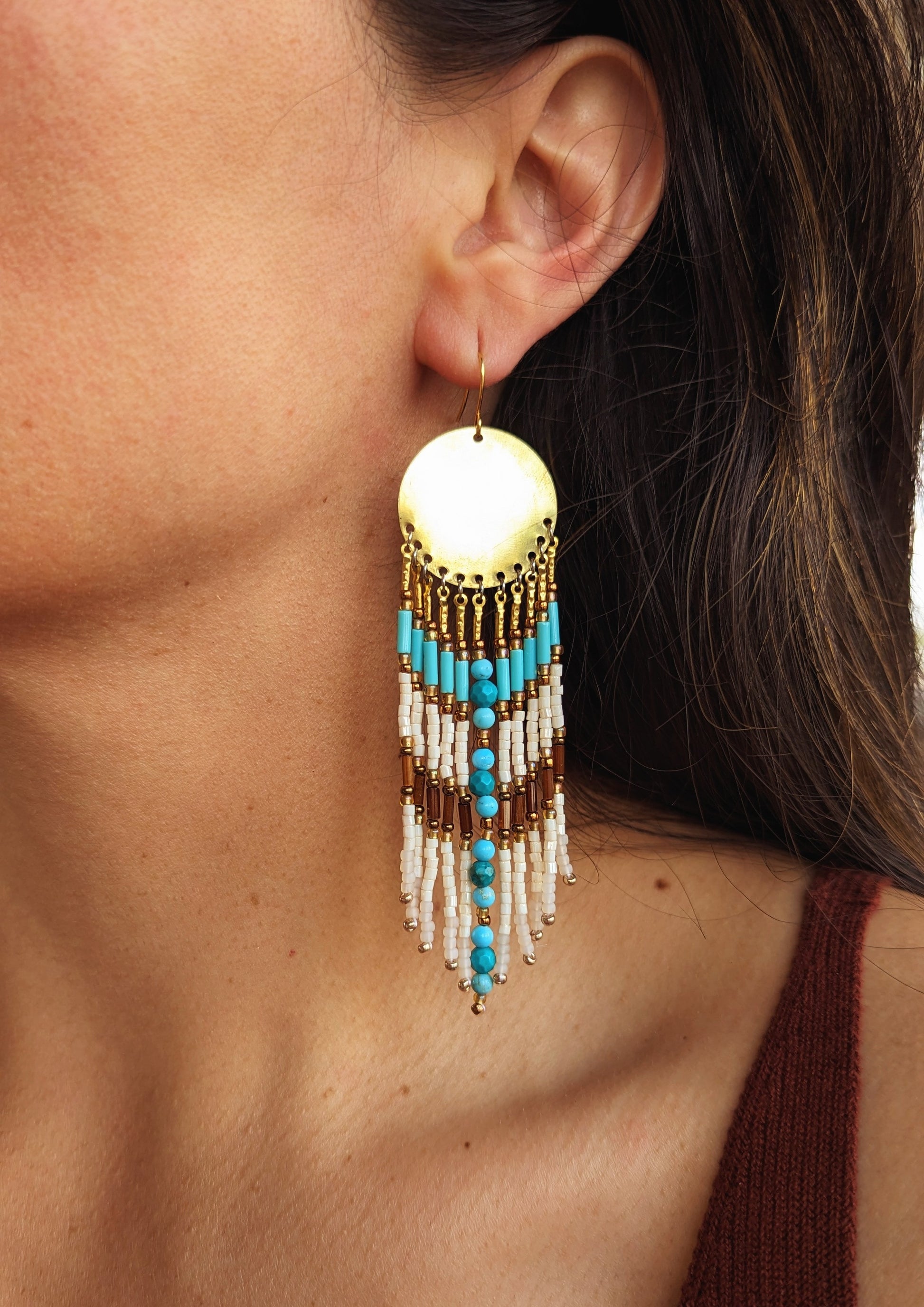 - Handmade beaded fringe earrings created with turquoise stones, glass seed beads, brass, and gold-plated ear wires.
